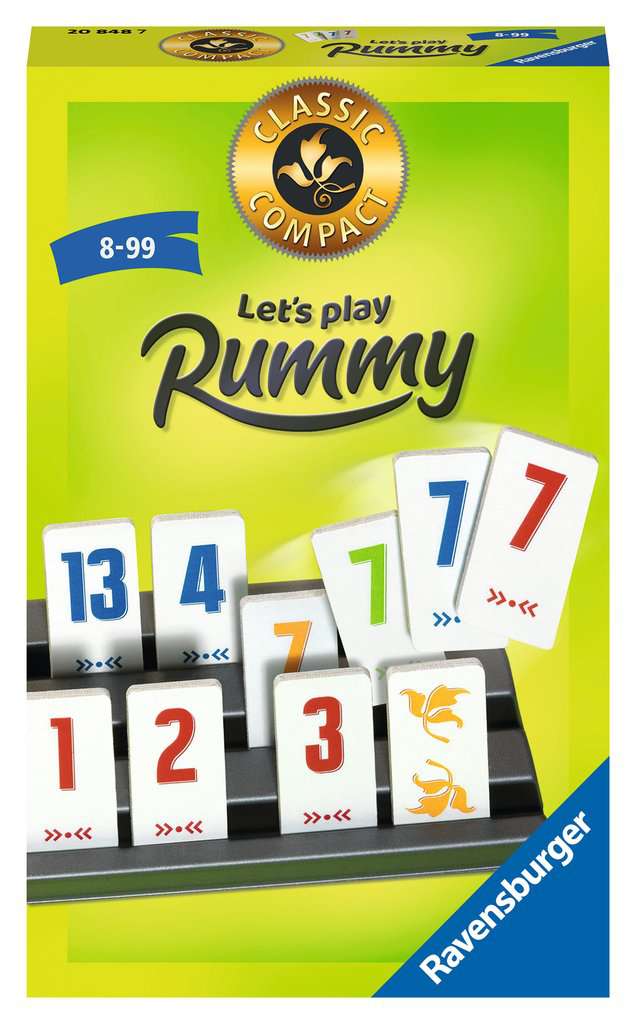 Eines der wohl bekanntesten Zahlen-Legespiele erscheint in kompaktem Format. Der Klassiker ist in jedem Urlaub oder Spieleabend dabei und eignet sich ideal als günstiges Geschenk, an dem 2 bis 4 Spieler ab 8 Jahren immer wieder Spielspaß erleben. Unzählige Möglichkeiten gibt es beim Anlegen der Zahlenkärtchen an unterschiedliche Kombinationen, die sich im Laufe des Spiels auf dem Tisch bilden. Wer wird mit Taktik, etwas Glück und dem besten Überblick zuerst alle seine Kärtchen los?Jeder Spieler erhält zu Beginn 14 Zahlenkärtchen, die er auf seiner Ablagebank so platziert, dass nur er sie einsehen kann. Es gibt jeweils zwei Sätze von 1 bis 13 in vier Farben, daneben 4 Joker, die als Ersatz für eine Zahl eingesetzt werden dürfen.Im Spiel geht es darum, entweder Reihen mit fortlaufenden Zahlen einer Farbe auf den Tisch zu legen oder aber Sätze einer gleichen Zahl in unterschiedlichen Farben. Sobald man erstmalig ablegen durfte, ist man berechtigt, an allen ausliegenden Kombinationen anzulegen. Auch dürfen bestehende Reihen oder Sätze umgebaut und neue Kombinationen erschaffen werden.Der erste Spieler, der die Runde beendet, erhält die Summe der verbliebenen Kärtchen seiner Mitspieler als Gewinn gutgeschrieben, die anderen Spieler vermerken ihre Minuspunkte, Nach einer zuvor vereinbarten Rundenzahl gewinnt der Spieler mit den meisten Punkten. Let’s play Rummy bietet so viele Möglichkeiten und Spannung bis zum Schluss, dass gleich die nächste Spielrunde ansteht! Warnhinweis nach Spielzeug-VO nicht erforderlich.