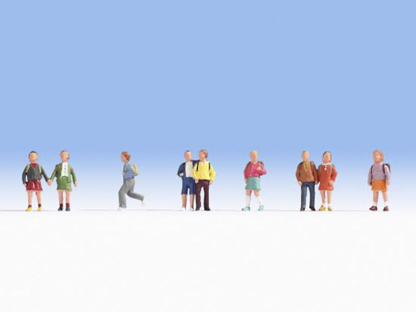 2017 feiern wir ein kleines Figuren-Jubiläum: 1997 kamen die ersten NOCH Figuren auf den Markt und in der Zwischenzeit hat sich das Programm ganz schön gemausert. Mittlerweile führen wir über 250 verschiedene Figuren-Sets und bieten auf modellfiguren.de 500 einzelne Figuren an. Das kann sich auf jeden Fall sehen lassen. Das Modellfiguren-Set »Kinder« beinhaltet neun Figuren. Alle sind für die Spurweite N, also für den Maßstab 1:160, geeignet und sind handbemalt. Zwei Mädchen halten sich an den Händen. Die linke Figur ein rotes, knielanges Kleid, eine graue Strickjacke, rote Socken und gelbe Schuhe. Die rechte Figur trägt eine grüne Jacke, ein weißes T-Shirt, einen grünen Rock, rote Socken und graue Schuhe. Der Junge, der gerade zum Bus rennt, hat eine hellblaue Jacke, eine graue, lange Hose und weiße Schuhe an. Die beiden nächsten Jungs unterhalten sich gerade auf dem Pausenhof über die Mädchen in ihrer Klasse. Der linke Junge trägt eine dunkelblaue Jacke, ein weißes T-Shirt, eine dunkelblaue, knielange Hose und weiße Schuhe. Das Outfit des rechten Jungen besteht aus einen gelben Pullover, einer dunkelbraunen, langen Hose und schwarzen Schuhen. Ein anderes Mädchen ist gerade auf dem Weg zur Schule. Da es Sommer ist hat sie eine dünne, pinke Bluse, einen türkisen, knielangen Rock, weiße Kniestrümpfe und türkise Schuhe an. Auf dem Pausenhof ist vor Schulbeginn ein reges Treiben. Das Pärchen aus der 7. Klasse ist gerade auf dem Weg ins Klassenzimmer. Der Junge trägt einen braunen Pullover, eine dunkelblaue, lange Hose und braune Schuhe. Er hält seine Freundin an der Hand. Sie hat ein orangefarbenes, kurzes Kleid und gelbe Schuhe an. Zu guter letzt ist auch ein kleines Mädchen mit einem fliederfarbenen Pullover, einem orangefarbenen Rock, weißen Socken und braunen Schuhen auf dem Weg zum Unterrichtsbeginn. Es sind alles Schulkinder und deshalb trägt jedes Kind einen Schulranzen auf dem Rücken. Achtung: Nicht geeignet für Kinder unter 14 Jahren. Benutzung unter Aufsicht von Erwachsenen.