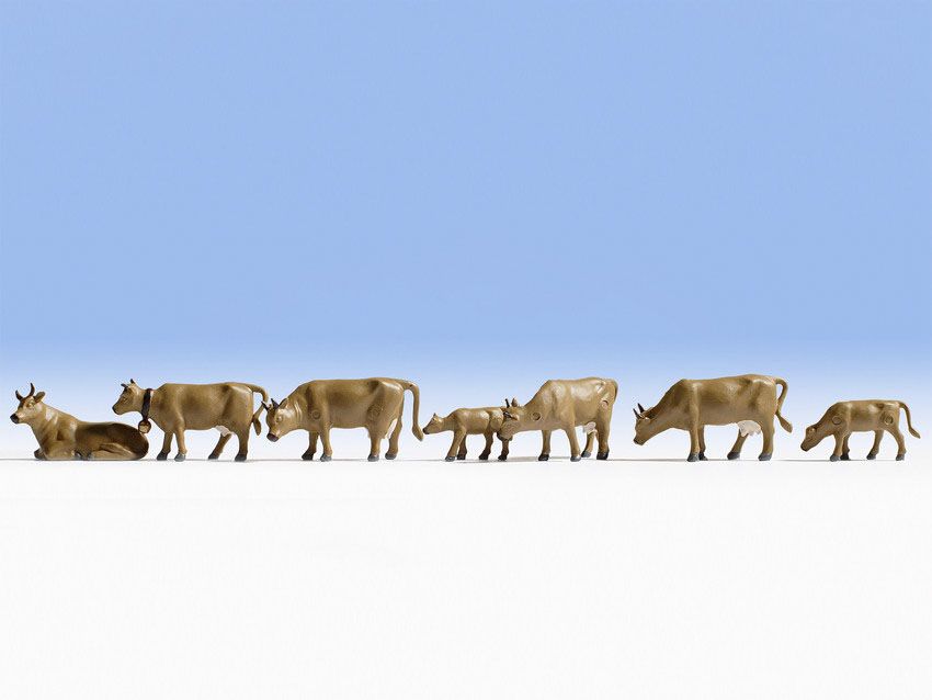 Das Set für die Spur N (Maßstab 1:160, ca. 1,1 cm hoch) enthält sechs Kühe sowie drei Kälber, die alle dunkelbraun sind. Die Kühe haben Hörner. Eine Kuh liegt auf der Weide und eine Andere trägt eine Glocke um den Hals, die an einem dunklen Band befestigt ist. Die Modellfiguren sind ideal zur Ausgestaltung von ländlichen Szenen geeignet. Achtung: Nicht geeignet für Kinder unter 14 Jahren. Benutzung unter Aufsicht von Erwachsenen.