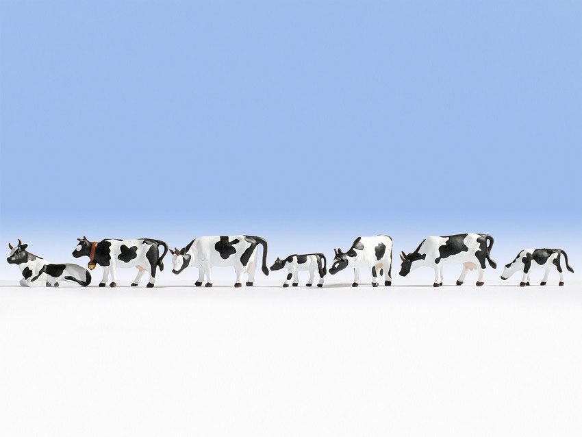 Kühe für jegliche Landschaftszene Das Set enthält fünf Kühe sowie zwei Kälber, die alle schwarz-weiß gefleckt sind. Die Kühe haben Hörner. Eine Kuh liegt auf der Weide und eine andere trägt eine Glocke um den Hals, die an einem roten Band befestigt ist. Die Modellfiguren sind ideal zur Ausgestaltung von ländlichen Szenen geeignet. Achtung: Nicht geeignet für Kinder unter 14 Jahren. Benutzung unter Aufsicht von Erwachsenen.