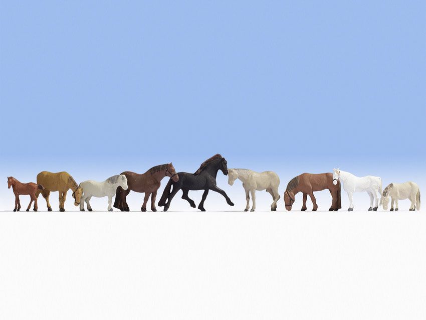 Das Set für die Spur N (Maßstab 1:160, ca. 1,1 cm hoch) enthält vier braune, ein schwarzes und drei weiße Pferde. Das schwarze Pferd galoppiert fröhlich, zwei der braunen Pferde genießen das saftige Gras und zwei weiße Pferde beobachten ihre Umgebung. Eines der drei Ponys frisst, währen die anderen Zwei sich an ihre Mütter halten. Besonders gut ist das Set für die Ausgestaltung von Landschaftsszenen von Modelllandschaften und Dioramen geeignet. Achtung: Nicht geeignet für Kinder unter 14 Jahren. Benutzung unter Aufsicht von Erwachsenen.