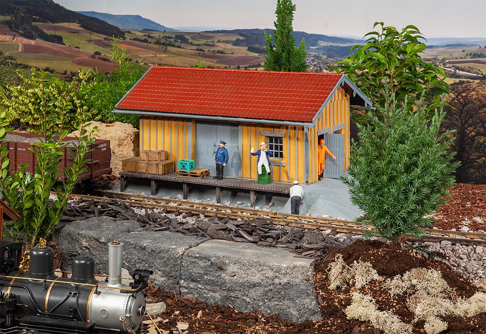 Verladung! Güterschuppen in Holzbauweise mit zwei Laderampen an Bahn- und Straßenseite zum Be- und Entladen von Pack- und Stückgütern. Auf jeder Rampenseite befindet sich eine große bewegliche Doppelschiebetür sowie an beiden Stirnseiten des Gebäudes jeweils eine bewegliche Tür. Maße: 560 x 320 x 275 mm Achtung: Nicht geeignet für Kinder unter 14 Jahren. Benutzung unter Aufsicht von Erwachsenen.