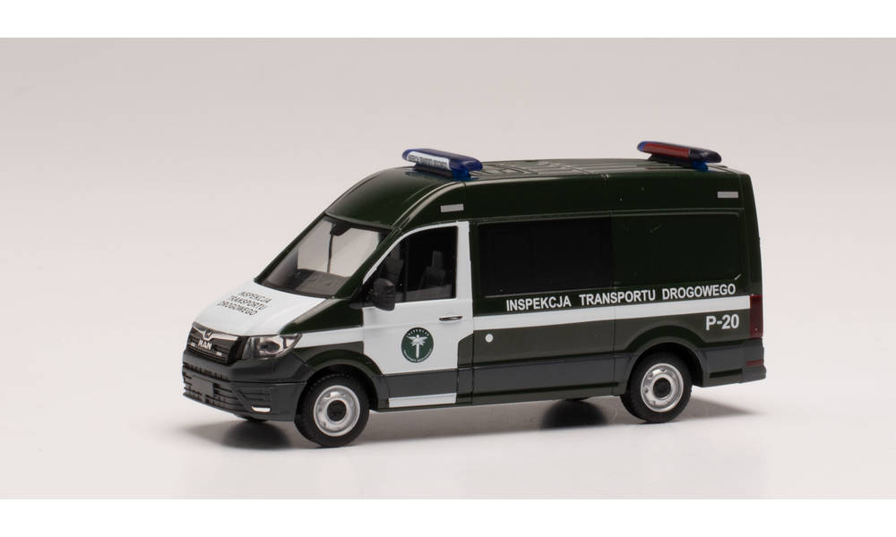 In Polen wird der aktuelle MAN TGE von der Inspekcja Transportu, dem Gegenstück zum BAG in Deutschland, für LKW-Kontrollen eingesetzt. Das dunkelgrüne Fahrzeug mit weißen Türen trägt zwei Warnlichtbalken und wird von Herpa in einmalig limitierter Auflage produziert. Maßstabs- und originalgetreues Kleinmodell für erwachsene Sammler und Modellbauer. Nicht in die Hände von Kindern unter 15 Jahren!