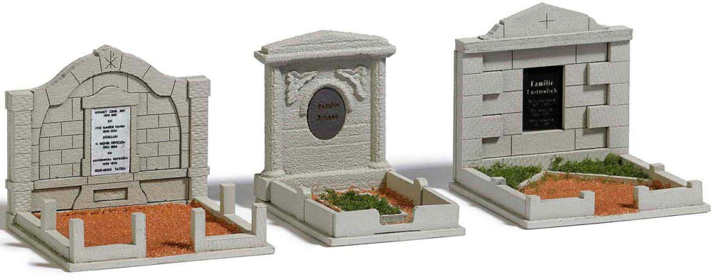 Drei große Steingräber in unterschiedlichen Formen und Größen. Mit Beflockungsmaterial für die Grabbepflanzung. Bausatz. Achtung: Nicht geeignet für Kinder unter 14 Jahren. Benutzung unter Aufsicht von Erwachsenen.