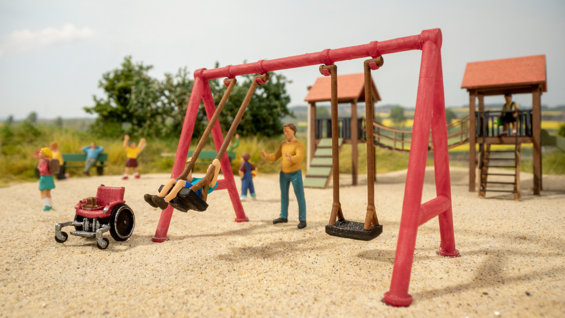 In hohem Bogen durch die Lüfte schwingen! micro-motion Kinderspielplatz Die NOCH micro-motion Schaukel eignet sich hervorragend, um einen Kinderspielplatz wie in der Wirklichkeit nachzugestalten und in Szene zu setzen. Wer erinnert sich nicht gerne an die schönen Tage im Sommer zurück, wo man mit den besten Freunden auf dem Spielplatz auf der Schaukel saß. Ob kleine oder große Kinder – hier kribbelt es bei jedem im Bauch wenn der Papa, die Mama oder auch die Großeltern von hinten schwungvoll das Kind auf der Schaukel anschucken. Wenn man den Trick raus hat, wie man sich alleine anschuckt, schwingt man in hohem Bogen durch die Lüfte und sieht den großen Spielplatz von oben. Das erweckt doch wirklich bei jedem wunderschöne Erinnernungen an einen Tag auf dem Spielplatz mit den Liebsten. Neben der Schaukel erfreuen sich Kinder vorallem auch an einer Vogelnestschaukel, wo eine Entspannung zwischen den Schaukeleinheiten perfekt eingebaut werden kann. Auch eine Rutsche, Wippe oder der Sandkasten darf auf keinem kindgerechten Abenteuerspielplatz fehlen. Hier geht doch wirklich jedes Kinderherz auf und Spaß ist vorprogrammiert. Fast jeder von uns dürfte schöne Kindheitserinnerungen an Spielplätze und an einzelne Spielgeräte haben. Die Schaukel, auf der wir von unseren Eltern stundenlang angeschuckt wurden; das Kinderkarussell, auf dem uns immer schwindelig wurde oder die Wippe, die so schwierig auszubalancieren war. Spielplätze sind in jeder Stadt und in jedem Dorf zu finden und somit ein wichtiger Bestandteil des menschlichen Zusammenlebens. Familien treffen sich, Kinder spielen und lachen, Eltern unterhalten sich über Arbeit und Erziehung und so mancher tauscht den neuesten Klatsch und Tratsch aus, während der Nachwuchs friedlich schaukelt. Nach dem letztjährigen großen Erfolg des Baums mit Schaukel haben wir uns an die Entwicklung von vier bewegten Spielplatzgeräten gemacht: Eine Kinderwippe, eine klassische Schaukel, eine Vogelnestschaukel und ein Kinderkarussell. Die handbemalten Spielgeräte und Figurenmodelle sind komplett montiert. Jedes Gerät wird von einem Motor, der sich direkt unter dem Modell befindet (Einbautiefe 35 mm) angetrieben. Die Mechanik für den Antrieb wird als Bausatz geliefert. Die mitgelieferte Elektronik wird an einen üblichen 16V Modellbahntrafo angeschlossen und ist für Gleich- und Wechselstrom geeignet. Die Geschwindigkeit des Spielgeräts kann auf der Platine eingestellt werden. Hinweis: Dem Bausatz liegt ein passender Spezialkleber bei. 5,6 x 7,8 x 6,5 cm, Einbautiefe 3,5 cm Nicht geeignet für Kinder unter 14 Jahren. Benutzung unter Aufsicht von Erwachsenen.
