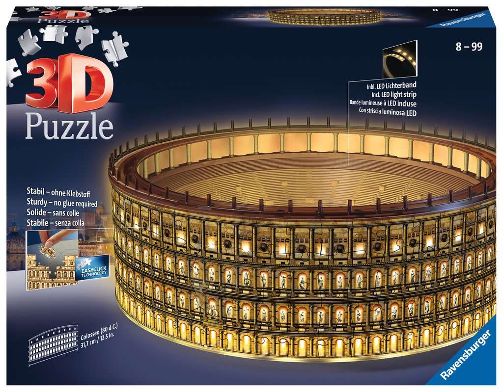 Das spektakuläre römische Kolosseum gibt es jetzt als beleuchtetes 3D Puzzle Gebäude für die eigenen vier Wände. Es ist faszinierend die antike Arena als 3D Puzzle in die Höhe zu bauen. Das Ergebnis beeindruckt fast so sehr wie das Original. Gladiatoren aufgepasst! Jetzt gibt es die berühmteste Arena des antiken Roms als beleuchtetes 3D Puzzle Gebäude. Die nummerierten Kunststoff-Puzzleteile passen dank EasyClick Technology perfekt ineinander und ermöglichen stabiles Puzzeln, ganz ohne Kleben. Die Nummerierung auf der Rückseite der Teile erleichtert das Vorsortieren und ermöglicht das Puzzeln nach Zahlen. Inhalt/Ausstattung 216 nummerierte Kunststoff-Puzzleteile + 46 Zubehörteile + Leuchtmodul inkl. LED Lichterband + Anleitung. Batterien nicht enthalten. Warnhinweis nach Spielzeug-VO nicht erforderlich.