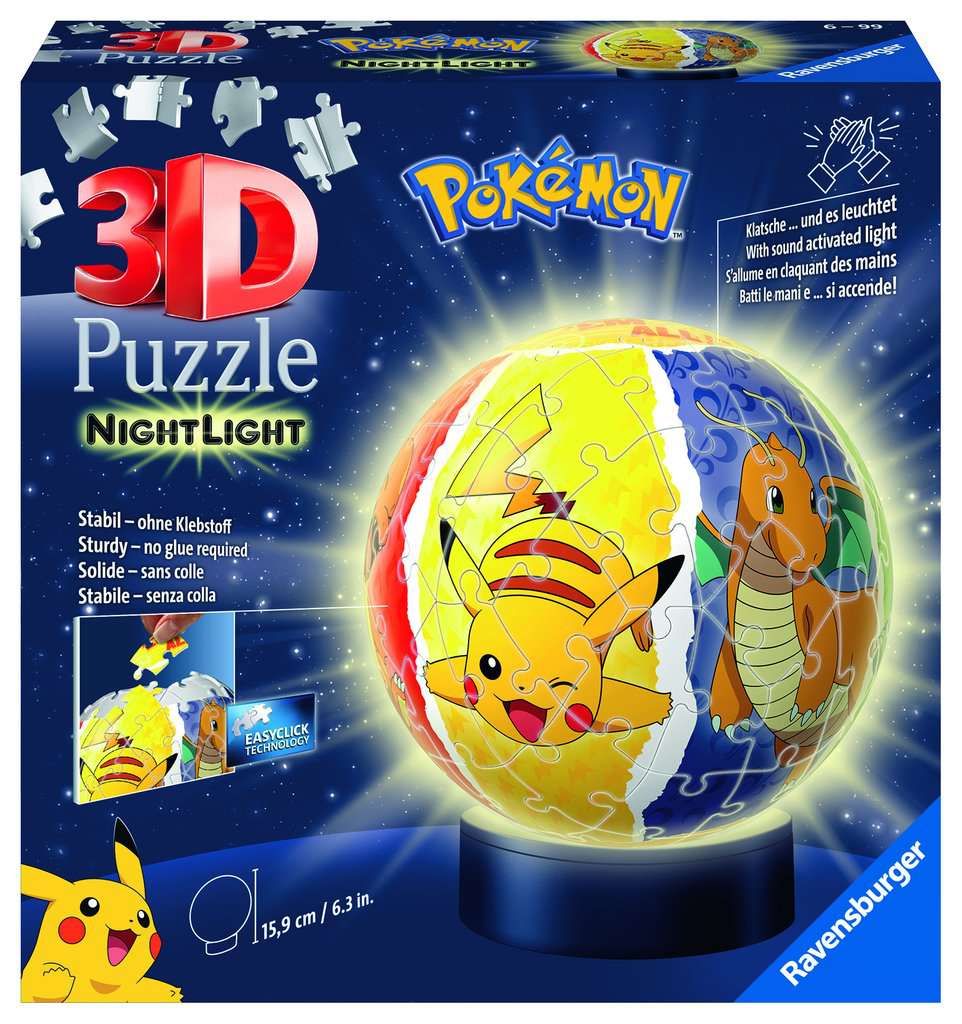 Dieser Ravensburger 3D Puzzle-Ball im coolen Design wird mit einem Händeklatschen zum außergewöhnlichen Nachtlicht, wenn der Leuchtsockel den Ball von innen erstrahlen lässt.Aus gewölbten Kunststoff-Puzzleteilen, die dank Easyclick Technology perfekt zusammen passen, entsteht Stück für Stück ein stabiler 3D Puzzle-Ball. Die Nummerierung der Teile auf der Rückseite ermöglichen einfaches Puzzeln nach Zahlen.Tipp: Der Leuchtsockel lässt viele weitere Motive in ein tolles Nachtlicht verwandeln! Inhalt: 72 nummerierte Kunststoff-Puzzleteile + Aufsteller + Leuchtsockel inkl. LED + Anleitung Warnhinweise: Achtung. Nicht für Kinder unter 36 Monaten geeignet. Kleine Teile. Erstickungsgefahr. Benutzung unter Aufsicht von Erwachsenen.