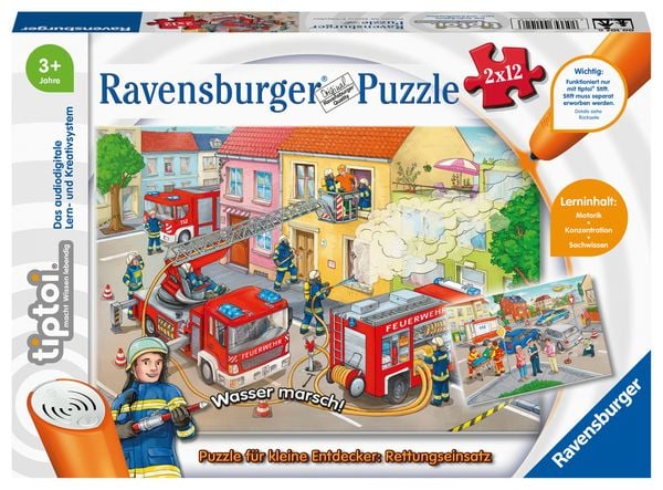Das tiptoi Puzzle für kleine Entdecker Rettungseinsatz vermittelt Wissen und macht Spaß. Welche Fahrzeuge sind im Einsatz, wenn es brennt? Woher kommt das Wasser, mit dem der Brand gelöscht wird? Und welche Aufgaben haben Polizisten und Rettungssanitäter bei einem Autounfall? Sobald die Kinder die Puzzles zusammengesetzt haben, erkunden sie mit tiptoi die Szenen und erfahren Spannendes über Einsatzfahrzeuge und Einsatzkräfte. Ganz spielerisch fördern sie dabei ihre Motorik und Konzentration. Im Puzzle für kleine Entdecker: Rettungseinsatz runden realistische Geräusche und ein schönes Lied das Erlebnis für Kinder ab 3 Jahren ab. Feuerwehrleute, Polizisten und Sanitäter bei ihrem Einsatz zu beobachten ist sehr spannend und lehrreich. tiptoi ist ein innovatives Lern- und Kreativsystem, mit dem Kinder die Welt spielerisch entdecken. Tippt man mit dem Stift auf ein Bild oder einen Text, erklingen passende Geräusche, Sprache oder Musik. Das Sortiment umfasst Bücher und Spiele mit den wichtigsten Lern- und Wissensthemen für Kinder ab 3 Jahren. Die zugehörigen Audiodateien lädt man einfach, sicher und schnell über den tiptoi Manager auf den Stift. Mit der WLAN-Edition des tiptoi Stiftes werden die Audiodateien direkt geladen. tiptoi-Stift nicht enthalten. Muss separat erworben werden. Achtung. Nicht für Kinder unter 36 Monaten geeignet. Kleine Teile. Erstickungsgefahr.