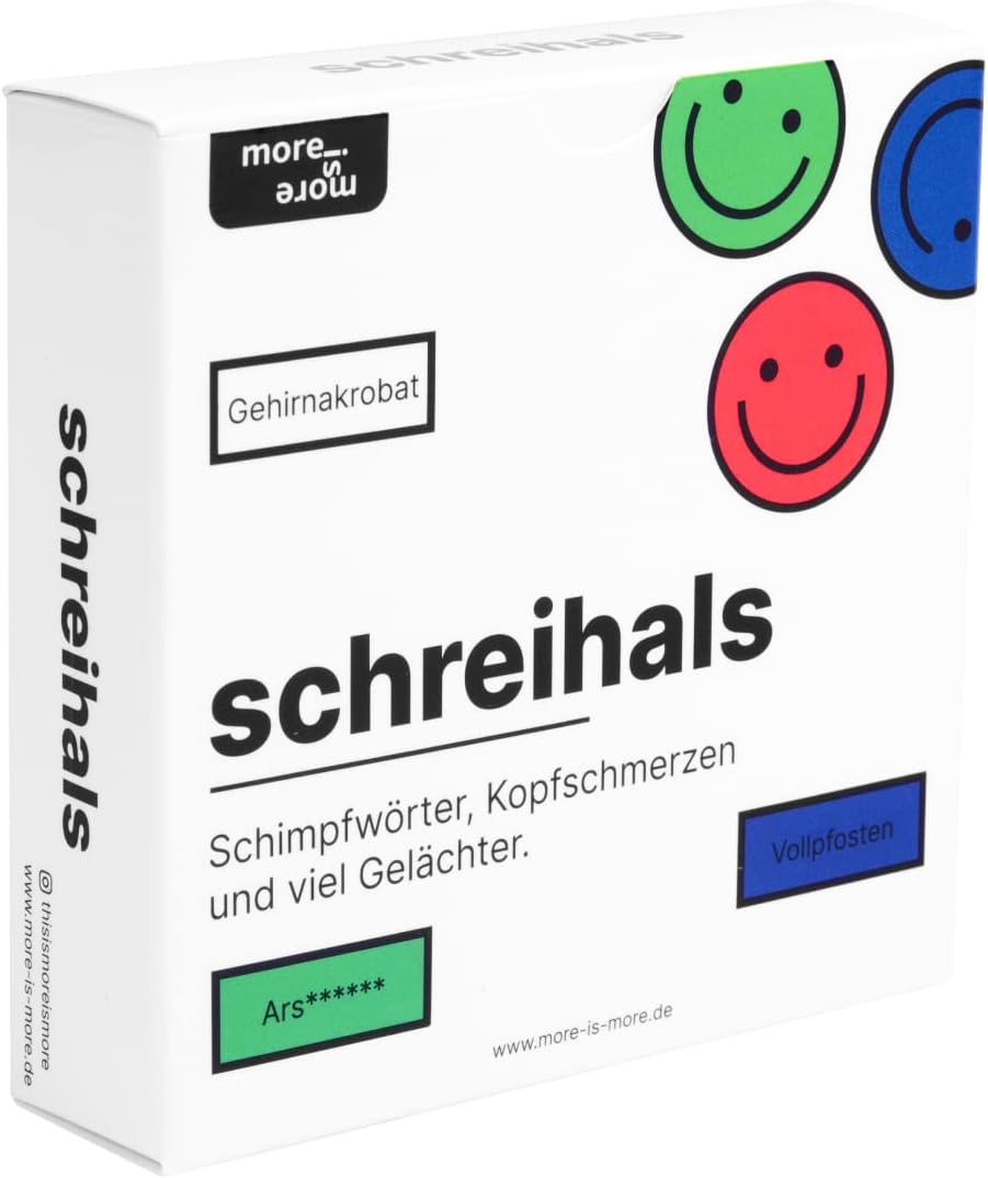 Schreihals ist ein witziges Partyspiel für deinen Partyabend! 55 Karten mit vielen Schimpfwörten sorgen für viel Gelächert und einer großen Dynamik in deiner Runde Geschwindigkeit gefragt – wer schreit zuerst das falsche Wort und wird dafür bestraft?! Leicht verständliche Regeln – bei schwarzem Text sagst du die Hintergrundfarbe, wenn der Text farbig ist sagst du die Farbe vom Wort und wenn ein Schimpfwort auf der Karte steht, schreist du das Schimpfwort! Aber sage niemals Ar*****! Egal ob Weihnachtsfeier, Geburtstagsparty, Silvester, Abschlussfeier, Junggesellenabschied, Vorglühen oder Festival – die lustigen Karten sorgen überall für Spaß und Action. Ob zu zweit oder in der großen Gruppe – Schreihals sorgt für einen witzigen Spieleabend mit viel Gelächter